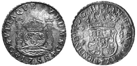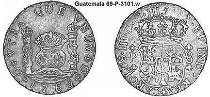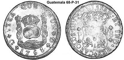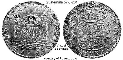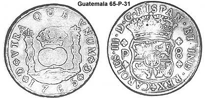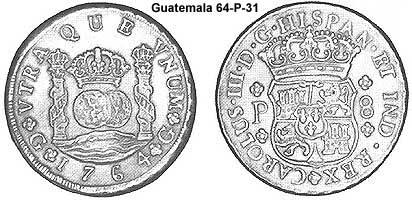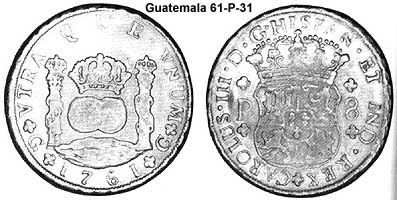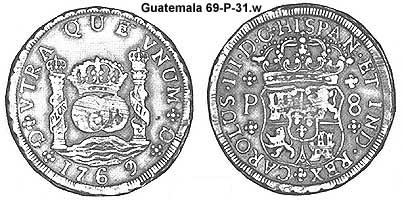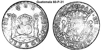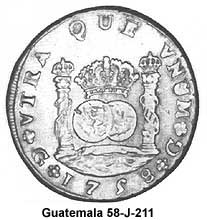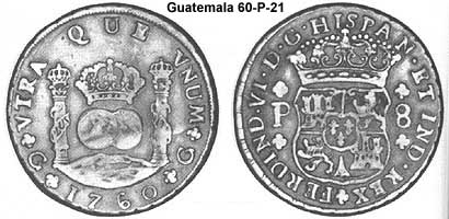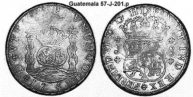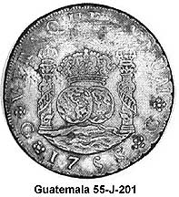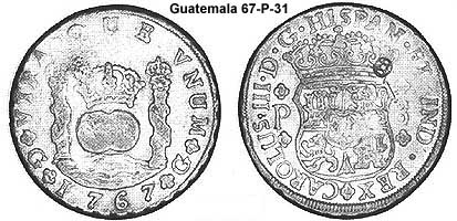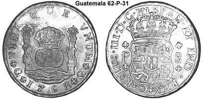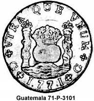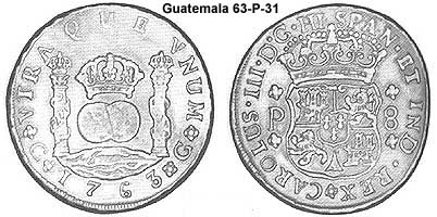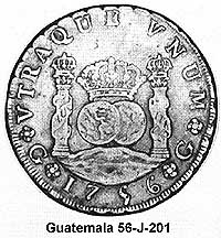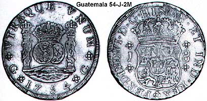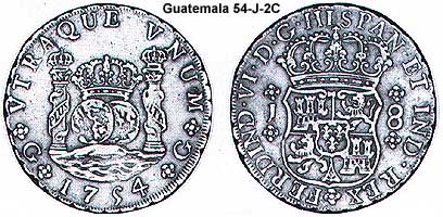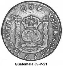 King of Spain and the indies/colonies).Guatemala was part of the Vice-Royalty of Nueva España. Although Guatemala Mint adapted the pillar design early, it was minting the design on irregularly cut flans, or macuquinas (cobs). These hammered coins were struck between 1733 to 1753. It was not only until 1754 that the milled coinage were started to be struck..