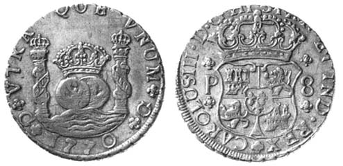 Reverse : Crowned quarter arms of Castile and Leon bearing the Bourbon crest in center, "8" to the right and assayer's initial to the left. Inscription [monarch's name]·D·G·HISPAN·ET IND·REX* ([monarch's name], by the grace of God,