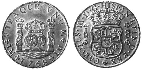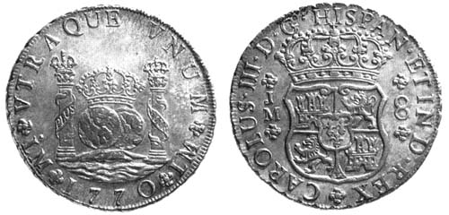 Reverse : Crowned quarter arms of Castile and Leon bearing the Bourbon crest in center, "8" to the right and assayer's initial to the left. Inscription [monarch's name]·D·G·HISPAN·ET IND·REX* ([monarch's name], by the grace of God,